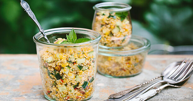 Два модных ингредиента — булгур и киноа — сделали этот салат необычайно полезным. В состав круп входят белки, аминокислоты, клетчатка и витамины группы В. Регулярное употребление салата помогает пищеварительному процессу, уменьшает уровень холестерина и выводит из организма шлаки.