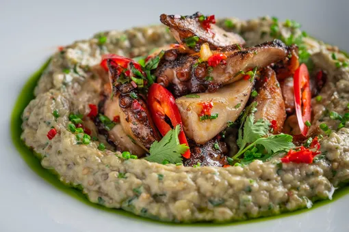 Это было одно из самых ярких впечатлений на самоизоляции – клянусь! Здесь немало вкусных блюд, но этот огромный осьминог, которого здесь готовят целиком – это бомба и абсолютный must try. Его томят в белом вине с пряными средиземноморскими травами или пекут в дровяной печи. А еще надо брать из нового осеннего меню томатный суп с маринованными морепродуктами (650 руб.), гирос с мраморной говядиной (850 руб.), а также нежное филе рыб (950 руб.) – дорада, сибас и пагр в соусе авголемоно.