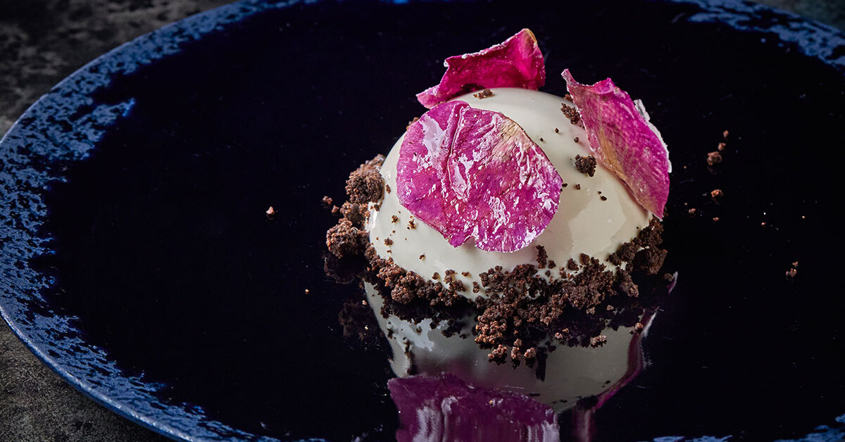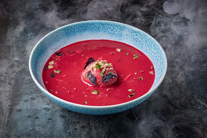 Максим Колпащиков («Фаренгейт») тоже вспоминает детство, и особенно трогательно это ему удается в десерте — сметанном мороженом с земляничным супом с дыней. Настоящая мечта космонавта! Текстуру держат зерна тапиоки, за ароматику отвечает ром, а сверху суп покрыт чипсом из слоеного теста.
