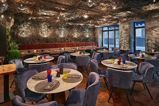 Дизайном интерьера Humans занималась Юна Мегре (бюро Megre Interiors). Она придумала собственную арт-версию подводного мира: пустила по стенам черно-серые фактурные волны, создала иллюзию текущей прямо по столам реки, прорубила магический латунный туннель между залами, поставила по периметру мягкие берега-диваны, а на панорамные окна повесила вместо штор рыболовецкие сети. 20 тысяч лье под водой — это в 10 минутах от Пушкинской.