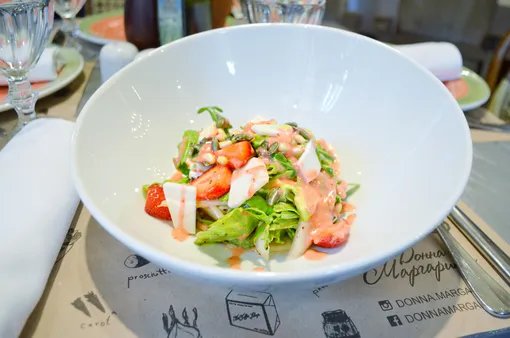 Рецептом самого летнего салата поделился ресторан «Донна Маргарита». Именно там его можно попробовать в исполнении профессионального шеф-повара Паоло Бокколини. Также советуем обратить внимание на специальное меню с блюдами из лисичек — сезон этих чудесных грибов как раз в разгаре.