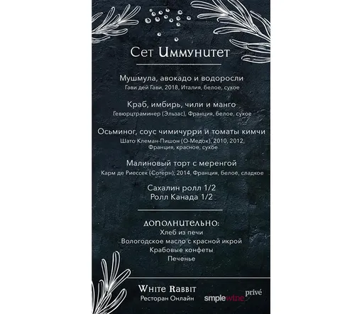 Ужины проходят ежедневно в 19:00. Вы бронируете место, к конкретному времени вам привозят сет, вы наряжаетесь, при желании зажигаете свечи, открываете хорошее вино (его можно заказать у Simple Wine Prive). Дальше дело за малым — подключаете Zoom и общаетесь. Хотите – соберите свою компанию, хотите – просто присоединитесь к тем, кто запланировал провести этот вечер с White Rabbit. Концепция напоминает Chef’s Table by White Rabbit, в рамках которого вокруг кухни размещена стойка для гостей, шеф-повар готовит и комментирует, а гости могут общаться как с ним, так и друг с другом. Самоизолировавшимся предлагается, по сути, та же история, только онлайн. Вести эти ужины будет как Владимир Мухин, так и другие шефы проекта.