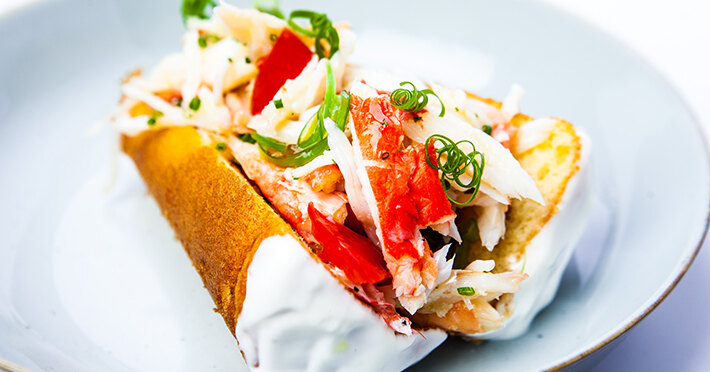Из горячего определенно стоит взять краба в аджике — ароматная зелень и томаты с легкой остротой и само крабовое мясо слились в идеальную летнюю композицию. Очень фотогеничными и не менее вкусными получились фаршированные фаланги камчатского краба с грибами, соусом кимчи и сыром. Тем же, кто следит за фигурой, лучше брать crab cake – богатое белком блюдо с полезным пюре из яблока и сельдерея.