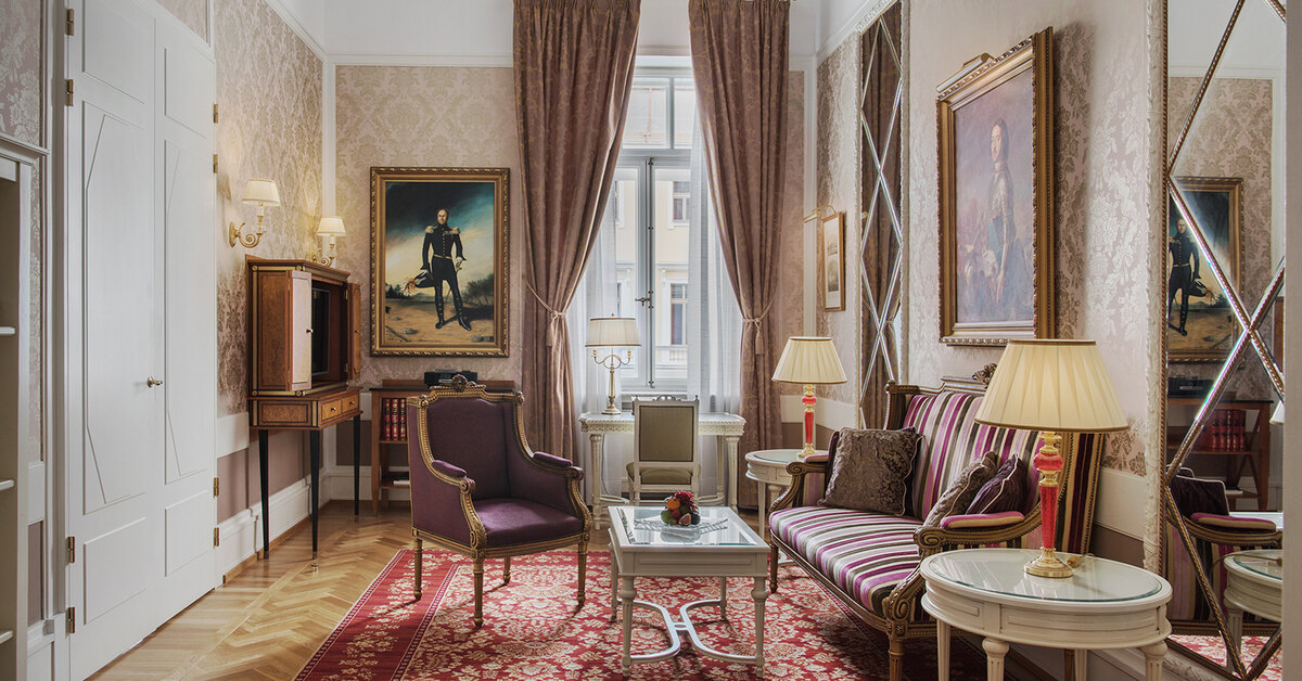 Первый российский гранд-отель, открытый с 1875 года, принимал гостей самого высокого уровня. В честь царской фамилии одни из апартаментов на историческом этаже отеля носят название «Романов». В люксе царит соответствующая атмосфера: антикварная мебель с богатыми золочеными украшениями, великолепные люстры и портреты членов императорской семьи. В оформлении номера приняли участие потомки царской династии: князь Михаил Павлович Романов-Ильинский подарил отелю книги, а князь Георгий Александрович Юрьевский — литографии и фото, которые можно увидеть в гостиной.