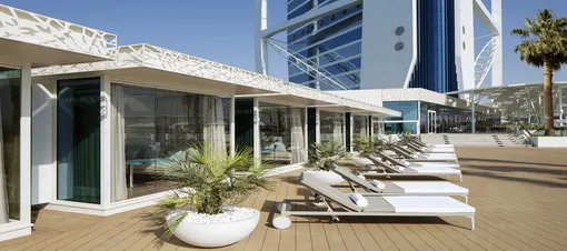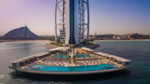 Одно из главных мест в отеле — роскошная терраса на воде, которая открылась в мае 2016 года. Она расположена у подножия отеля и весит 3000 тонн, а это, возвращаясь к нашему любимому сравнению, примерно половина веса Эйфелевой башни. На террасе расположены ресторан, бар, 32 пляжных домика (их можно снять, даже если не живешь в самом отеле), бассейн с пресной водой и бассейн-инфинити с морской водой, чей дальний бортик растворяется за горизонтом и создает видимость бесконечности водной глади. Несмотря на то что у Burj Al Arab есть свой приватный пляж с выходом к морю, гости в большинстве предпочитают загорать именно на террасе — все-таки это отдельный «экспириенс», который можно получить только в Дубае и только в Burj Al Arab. Пока вы будете лежать на удобных шезлонгах, официанты будут разносить фирменный попкорн и свежевыжатые соки, предлагать вам воду попрохладнее и вкуснейшее мороженое, чтобы жизнь стала еще слаще.