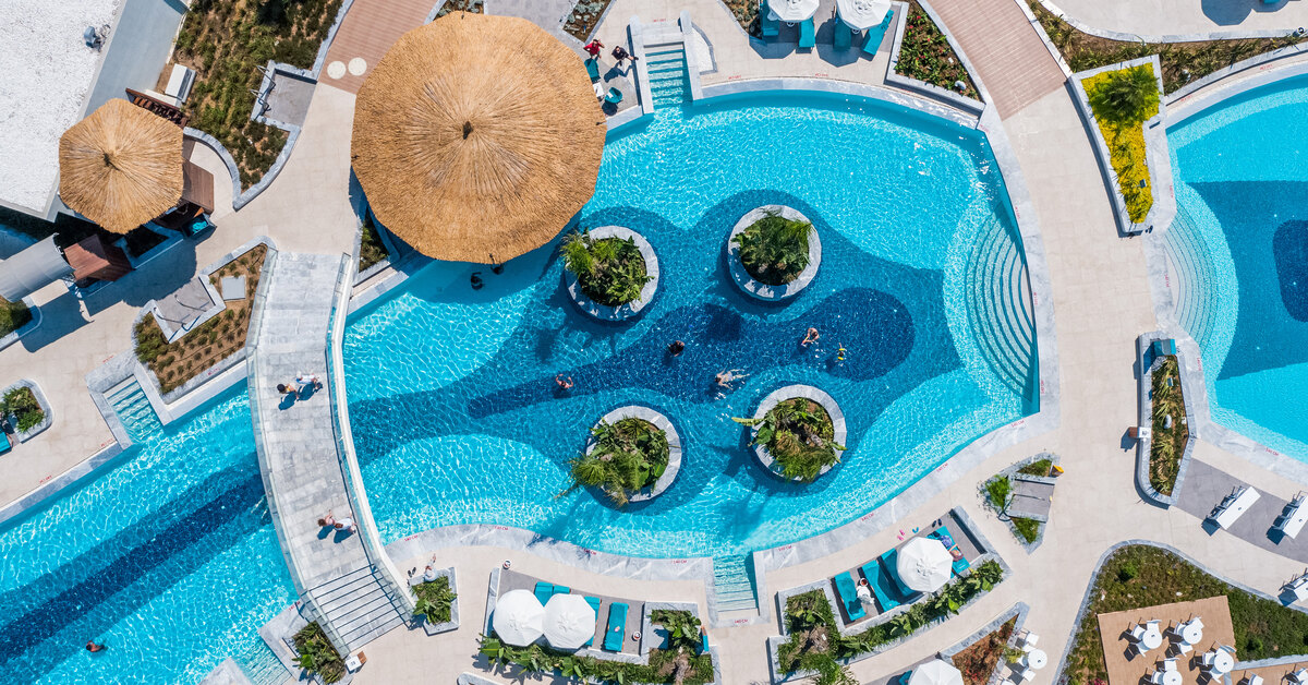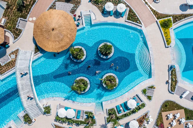 Но и день на пляже здесь может пройти незабываемо. Отель расположен в уединенной части залива с видом на острова — лучший пейзаж, который будет радовать глаз целый день. Располагайтесь на мягких лежаках или в кабане, в которой всегда приятная тень. Неподалеку также располагаются несколько больших бассейнов разной глубины, а если хочется уединения, то можно взять номер с прямым выходом к бассейну, доступ к которому будет только у вас и ваших соседей. Только представьте: проснуться утром в просторном стильном номере с видом на море и горы, выйти на балкон через него сразу попасть к прохладному бассейну, внутри которого также располагается бар с напитками, где можно заказать коктейль, не выходя из воды.