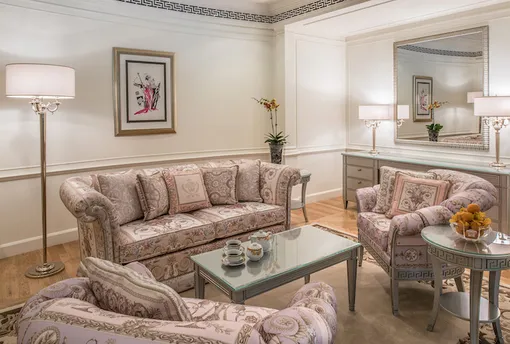 Оценить размах итальянского гостеприимства удастся с первых минут пребывания в Дубае: сначала закажите трансфер, чтобы добраться до дворца на лимузине. С момента прибытия все внимание займет архитектура отеля: масштаб Versace проявляется во всем, вплоть до элементов декора – главное лобби отеля украшено напольной мозаикой с изображением небезызвестной медузы площадью 1000 кв. м. На использование мозаики в интерьерах Донателлу вдохновила вилла Casa Casuarina в Майами, в которой жил и трагически погиб ее брат Джанни Версаче. В стенах Palazzo Versace Dubai она встречается с культовым для Дома греческим орнаментом, обрамляющим потолки, и легендарными принтами.
