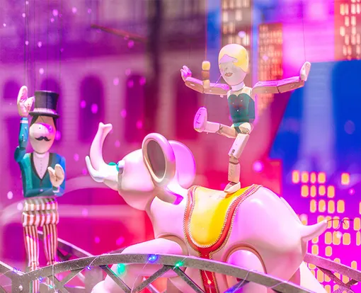 Первое, что замечаешь, только подходя к Галерее, — ее сказочные витрины, облепленные со всех сторон очередями из родителей и их маленьких ребятишек: все хотят поближе рассмотреть завораживающие инсталляции. В этом году там разворачивается история двух влюбленных голубков Пьера и Коко. Прохожу дальше и через парадные двери попадаю в универмаг — и тут же расплываюсь в улыбке: передо мной прямо в центре Галереи под знаменитыми переливающимися витражами синего купола возвышается «сладкая» елка из бесчисленного количества огромных конфетно-леденцовых шаров.