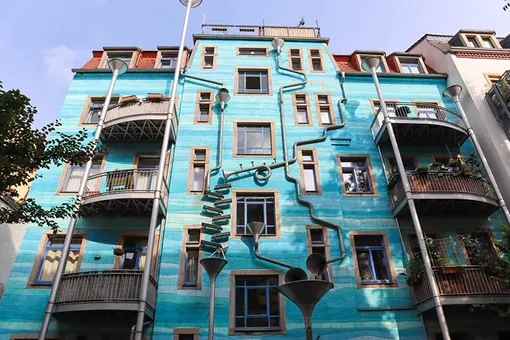 Kunsthofpassage – это всего лишь несколько дворов между Alaunstrasse 70 и Görlitzer Str. 23. Но в действительности это гораздо больше: у каждого дома – свое оформление с приставкой «арт». Например, есть оттенка лазури с трубами, в смысле с духовыми музыкальными инструментами, на фасаде.