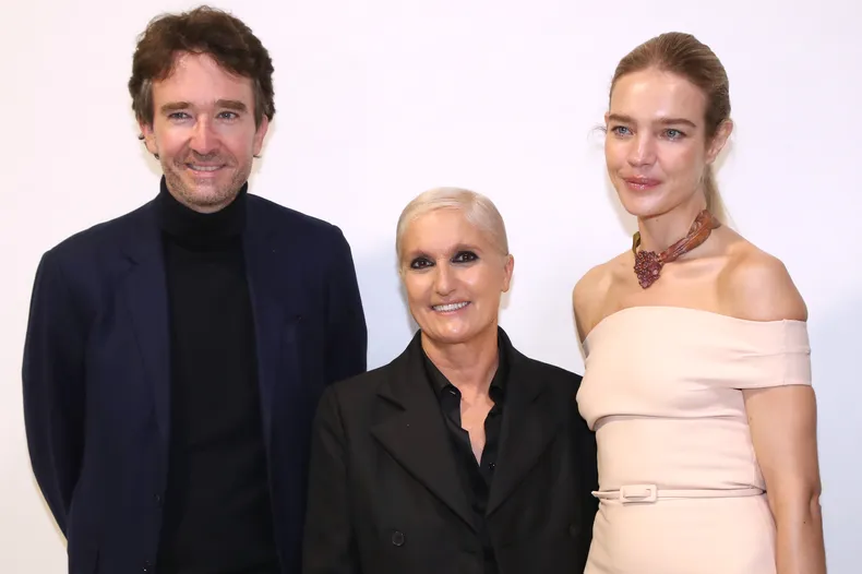 Наталья Водянова в кремовом платье с открытыми плечами и Дева Кассель в корсете и широких брюках на показе Christian Dior в Париже