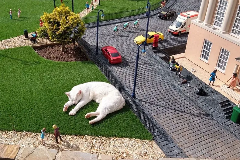 Фото дня: кот уснул посреди английского парка миниатюр — и стал героем мемов