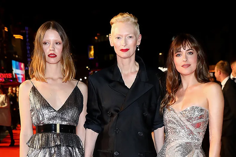 Миа Гот, Тильда Суинтон и Дакота Джонсон на премьере «Суспирии» в Лондоне