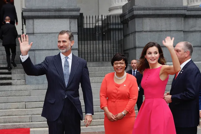 Королева Летиция в безупречном платье цвета шаронской розы на приеме в Новом Орлеане