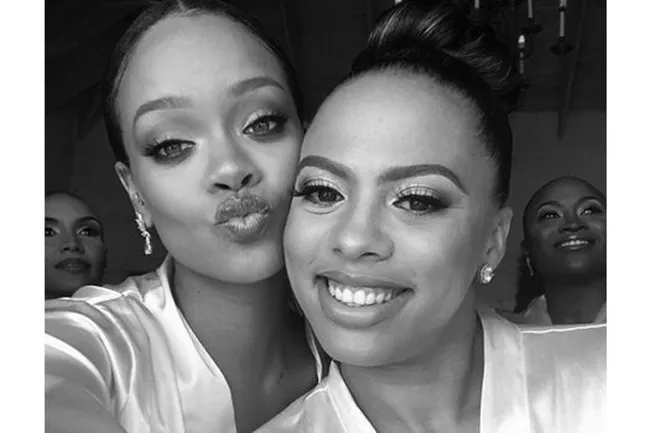 Постройневшая Рианна в кобальтовом платье на свадьбе лучшей подруги
