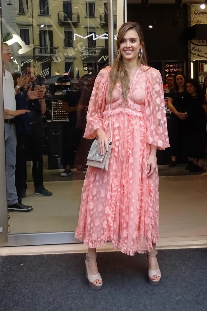 38-летняя Джессика Альба в стиле миллениалов: звезда в воздушном розовом гуляет по Милану