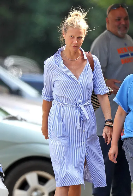 Гвинет Пэлтроу так полюбила престижный пригород Нью-Йорка — Хэмптонс, что вот уже несколько недель наслаждается отдыхом на этом закрытом курорте и заряжает внутренние «батарейки» перед возвращением в мегаполис. Вчера актриса и бизнесвумен была замечена папарацци на автостоянке: 46-летняя Гвинет отправилась по делам и решила совсем отказаться от мейкапа, а вместо укладки просто скрутила волосы в небрежный пучок. Чтобы и в последние дни августа не покидало ощущение лета, Пэлтроу выбрала для прогулки хлопковое платье в полоску, плетеную сумку и любимые белые биркенштоки, которые в последние годы стали для нее незаменимой парой обуви на теплую пору.
