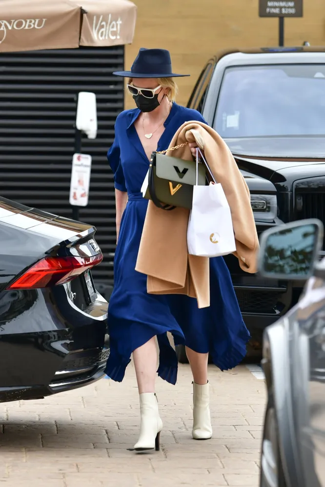 Шарлиз отправилась в модный ресторан Nobu в Малибу, любимый многими селебрити. Наша героиня недела летящее платье насыщенного синего цвета с акцентным поясом на талии. Безупречный цвет на все времена, когда хочется выглядеть по-королевски роскошно. Столь яркий оттенок Шарлиз удачно срифмовала с белыми ботильонами и классическим пальто оттенка кэмел, которое она несла в руках. Важной деталью образа стала кокетливая шляпка в лучших традициях истинных див. Шикарна, да и только.