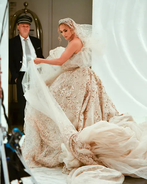 Именно на съемках сцены свадьбы Джей Ло и подловили папарацци. Звезда выходила из автомобиля в роскошном платье цвета айвори с пышной юбкой, украшенной стразами и вышивкой.