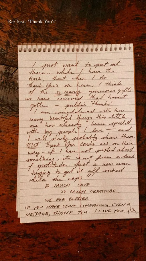 Джиджи выложила в Инстаграме (Социальная сеть признана экстремистской и запрещена на территории Российской Федерации) рукописное письмо. Она выразила признательность за все теплые слова и подарки, полученные в своем новом статусе. «Я ошеломлена тем, сколько замечательных слов и вещей моя малышка удостоилась от людей, которых я люблю. Наверно, мне стоит показать эти подарки. Мои благодарственные открытки уже в пути к каждому из вас: если я кому-то не сказала спасибо, то это просто потому, что я как мама делаю все дела, пока моя дочка спит», — поделилась Хадид.