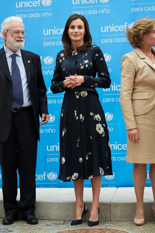 Королева Летиция всегда выступала за демократичный подход к моде. Мало того, что первая леди патриотично поддерживает испанские бренды, так она еще и регулярно выходит в свет в вещах из масс-маркета. Одной из любимых бюджетных марок для нашей героини стали Massimo Dutti. В платье их авторства королева несколько часов назад посетила торжественную церемонию вручения премий ЮНИСЕФ в Мадриде — свой образ она дополнила замшевыми лодочками слинг-бэк и кожаным клатчем Carolina Herrera. Заметили еще одну особенность? В этом же платье мы уже видели супругу короля Филиппа VI в апреле этого года, когда она присутствовала на пасхальной службе в Пальма-де-Мальорке, — практичностью монаршей особы можно только восхищаться.