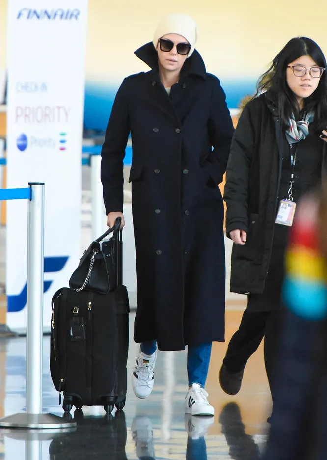 Шарлиз Терон, как и любая актриса ее уровня, часто страдает от своей популярности. Актрисе сложно провожать детей в школу, ужинать с друзьями и путешествовать — повсюду ее узнают и докучают повышенным вниманием. Но Терон научилась мастерски «мимикрировать» под обычных прохожих: к примеру, вчера Шарлиз предстоял очередной перелет. В Международный аэропорт имени Джона Кеннеди звезда прибыла в черном двубортном пальто свободного кроя с поднятым воротником, белой шапке и солнцезащитных очках. Узнать в ней звезду «Адвоката дьявола» и «Безумного Макса» было непросто, но ушлые папарацци все же сумели сделать несколько кадров с нашей героиней.