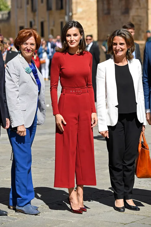 Если кто-то считает, что кюлотам не место в деловом гардеробе, то это точно не королева Летиция. Главная испанская модница вот уже во второй раз блистает в комплекте от одного из своих любимых брендов — Hugo Boss. Сначала супруга короля Филиппа VI вышла в свет в алом джемпере и укороченных брюках в марте, посетив конференцию в королевском дворце Эль-Пардо. А сегодня первая леди приехала на семинар для журналистов в городе Бурго-де-Осма в этом же алом тотал-луке. Монохромный образ наша героиня поддержала при помощи лодочек в тон на высокой шпильке — и, безусловно, стала самой эффектной гостьей мероприятия.