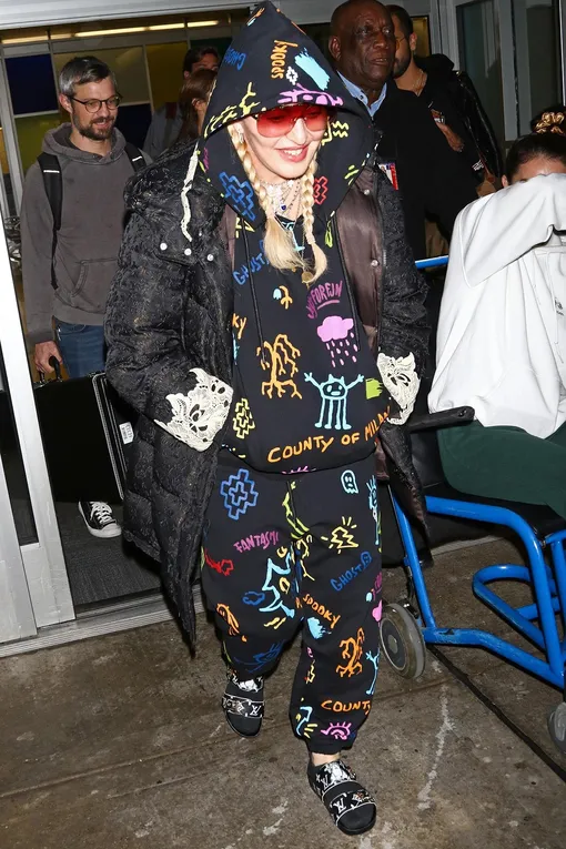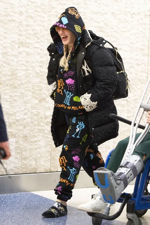 Мадонна в пуховике с кружевом, пестром костюме и сандалиях Louis Vuitton прилетела в Нью-Йорк
