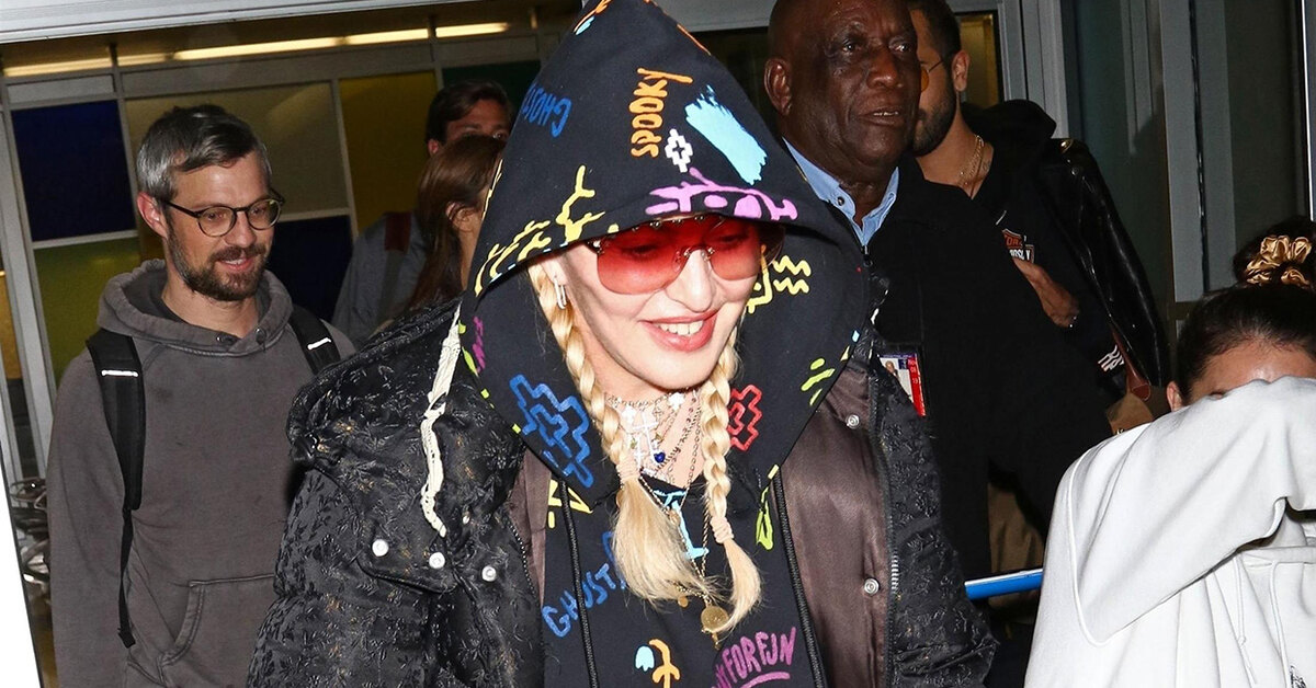 Мадонна в пуховике с кружевом, пестром костюме и сандалиях Louis Vuitton прилетела в Нью-Йорк