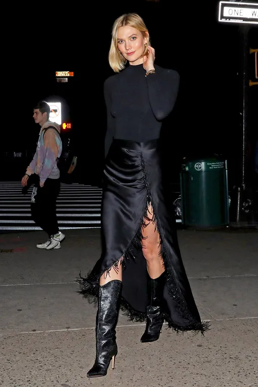 В этом сезоне актуальны сапоги длиной до колена: в зависимости от стиля и ширины голенища их можно носить с платьями, заправленными широкими брюками (ультрамодное сочетание, но идет далеко не всем) и, конечно, с юбками. Одни модницы предпочитают щеголять в мини, пока погода еще позволяет, а вот Карли Клосс сделала ставку на асимметричную макси-юбку с блестящей бахромой и вышивкой. Высокий разрез позволил модели показать сапоги Schutz на шпильке во всей красе и подчеркнул стройные ноги Карли — не зря наша героиня рискнула прогуляться по ноябрьской улице без чулок.