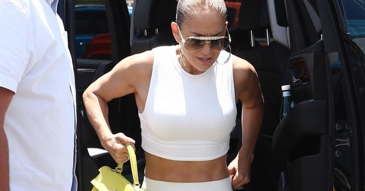 Дженнифер Лопес одинаково хороша на красной дорожке в пышных оборках Giambattista Valli и в спортивной экипировке по пути в фитнес-клуб. И мы не устанем восхищаться тем, как эффектно дива выглядит в свои 50! Взять, к примеру, один из ее последних фитнес-образов: Дженнифер приехала на тренировку в белоснежном комплекте Naked Wardrobe из кроп-топа в облипку и велосипедок, которые так выгодно могут смотреться лишь на рельефной и подтянутой фигуре. В лучших традициях спортшика дива дополнила свой выход очками в переливающейся на солнце оправе, серьгами-хулахупами, любимым тумблером с россыпью страз и неоновой сумкой Hermès.