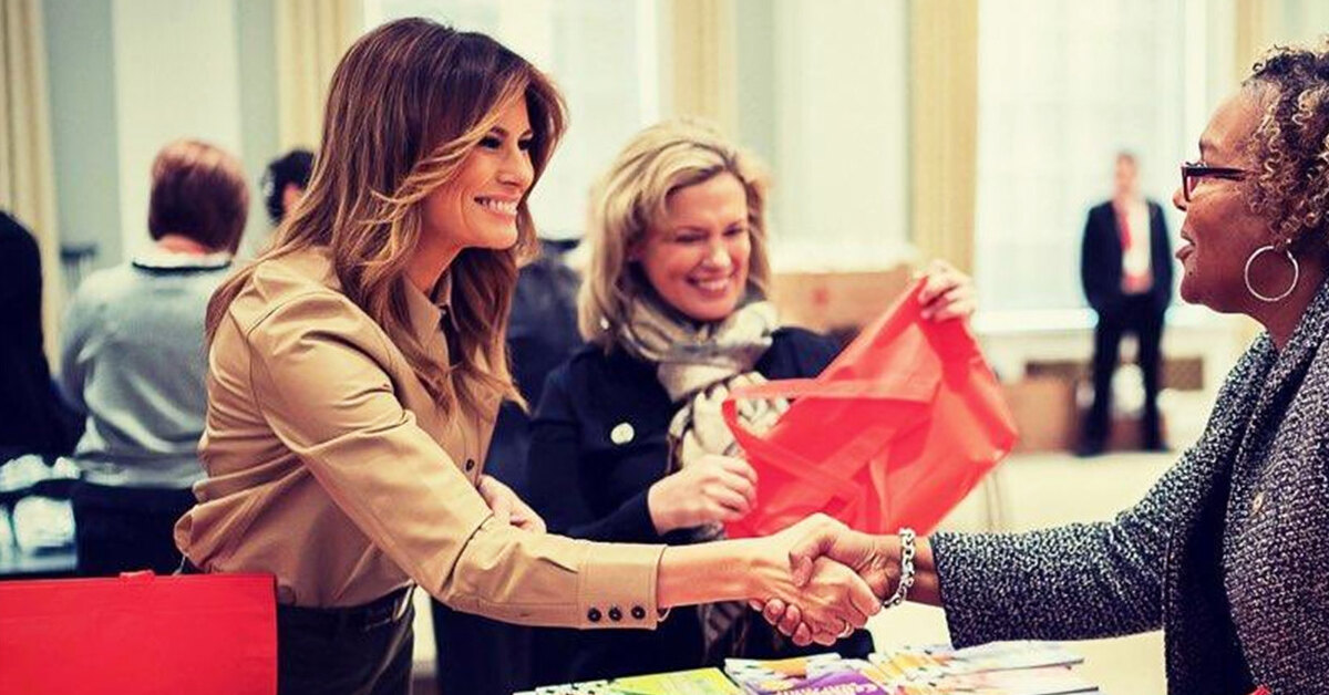 Не только героини стритстайла без ума от одежды из кожи: даже Мелания Трамп не устояла и дополнила свой деловой гардероб бежевой рубашкой Equipment. Эффектный и ультрамодный верх первая леди США объединила с укороченными брюками в оттенке хаки и демократичными лоферами Zara с принтом под рептилию. В этом комфортном, но элегантном аутфите Мелания навестила сотрудников Национальной штаб-квартиры Американского Красного Креста в Вашингтоне и помогла им собрать подарочные наборы для военнослужащих, проходящих службу вдали от дома.